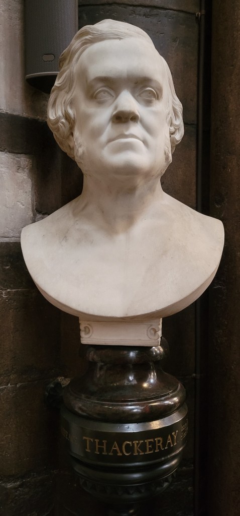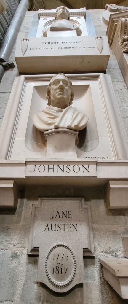 After the Lady Chapel, we made our way along the south corridor–they were really making me wait to see Poets’ Corner! All at once I started to see familiar names I have studied for more than 40 years: Thomas Hardy, William Makepeace Thackery, William Wordsworth, Jane Austen, William Shakespeare, Charlotte Emily and Ann Bronte, DH Lawrence, Lord Byron, Gerard Manley Hopkins, Robert Browning, Alfred Lord Tennyson, Ted Hughes, Philip Larkin, Henry Wadsworth Longfellow (who is, in fact, American), and William Blake.
