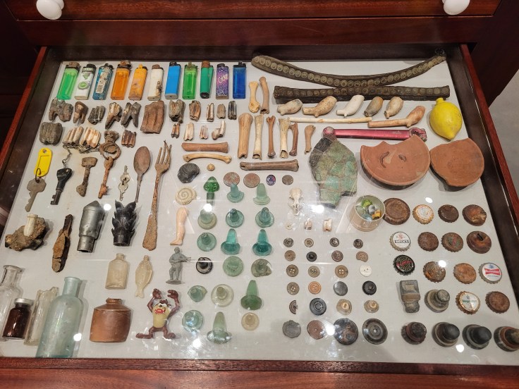 Before I close out Tate Modern, I need to get to mudlarking. Wikipedia says it involves “someone who scavenges in river mud for items of value” and there was a big display of artifacts from River Thames within the Tate.