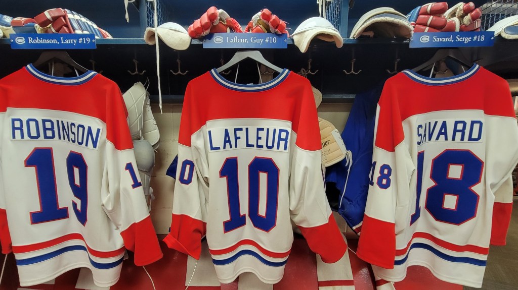 The highlight for me was the recreation of the Montreal Canadian locker room, full-size with jerseys. It was so cool. It made me think about how so many of those guys were not large humans and how they made hockey about the beauty of skating and man were they good at that. Things changed, then, when NHL teams started recruiting goons to steamroll and claw at the skaters. Mario Lemieux–who was born in Montreal–used to call the NHL a “garage league,” because they allowed the goons to slam and start fights with the talented players.