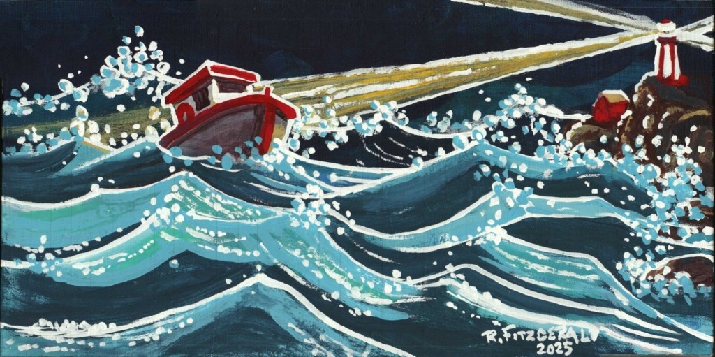 An example of this is “Riding It Out” (2025), which depicts a boat being buffeted by high seas–yet a lighthouse is near to provide hope and guide the sailors to port.